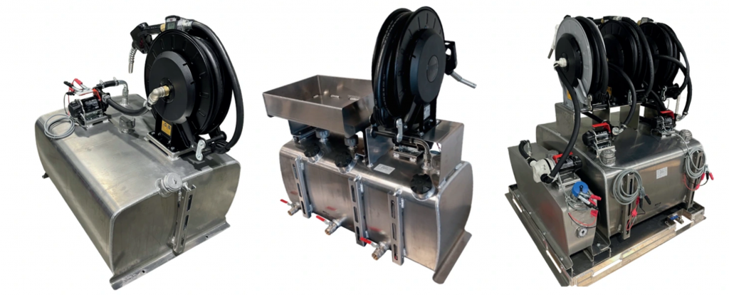 These tailored tanks can be delivered equipped with a complete suite of accessories, including transfer pumps, hose reels, volumetric flow meters, automatic shut-off nozzles and more. Depending on the fluid and available source of energy in the van, ACGB suggests the right alternatives to choose from.