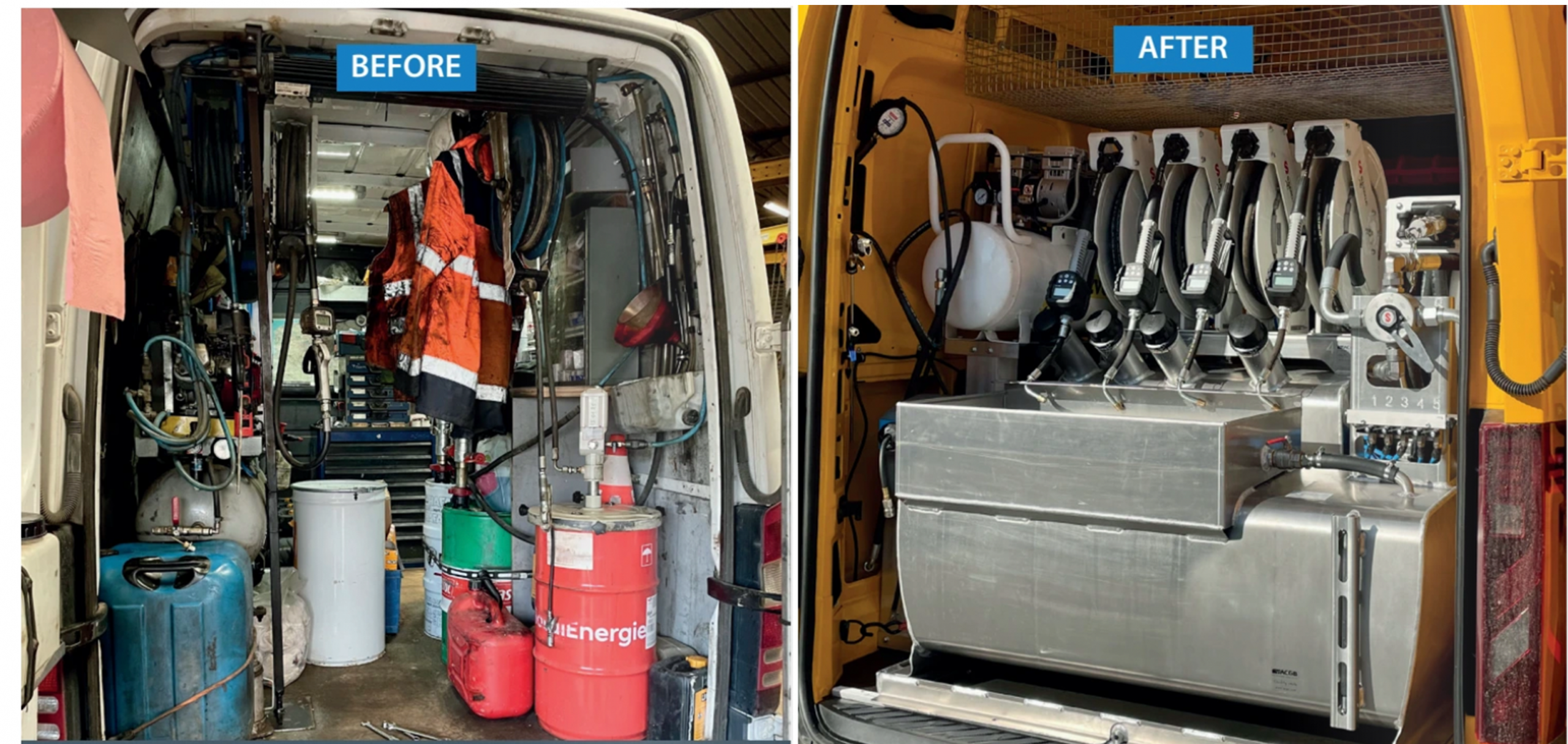 AFTER: A JCB service vehicle after the installation of an ACGB lube skid. The integrated compartments keep new and waste oils securely stored, with all pumps and accessories neatly in place, creating a safer, more organised and efficient workspace.